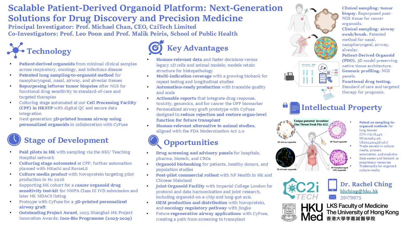 Collaborating with the HKU Teaching Hospital network and planning a Joint Organoid Facility with Imperial College London for global harmonization, the team has secured paid pilots and the Outstanding Project Award at the 2025 Shanghai-HK Project Innovation Awards.